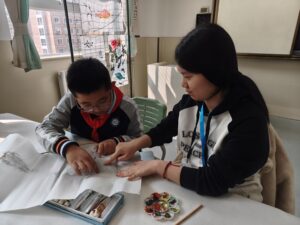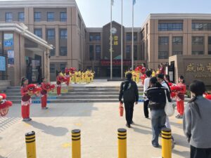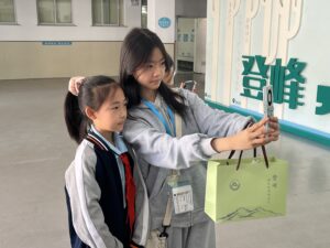 第二日上午,行程迎來重頭戲——到訪姊妹學校威海市文登區峰山小學。巴士剛抵達校門,學校領導及部分師生已在校門口等候,學生獅鼓隊夾道迎接,並引領我們走向操場中央。首先由孫淑霞校長致歡迎辭,隨後學生司儀逐一介紹校內各種非遺小作坊。之後,師生一行移步報告廳,兩校校長分別發表講話,分享辦學理念,並展望未來合作的方向與期許。峰山小學的學生才藝出眾,接連呈現傳統文化表演,精彩紛呈,令人讚嘆不已。隨後,他們還邀請我校學生一同逛大集、品嘗美食並參與集體遊戲,氣氛熱烈融洽。臨別之際,兩校學生依依不捨,合影留念,為這段難忘的交流留下美好回憶。